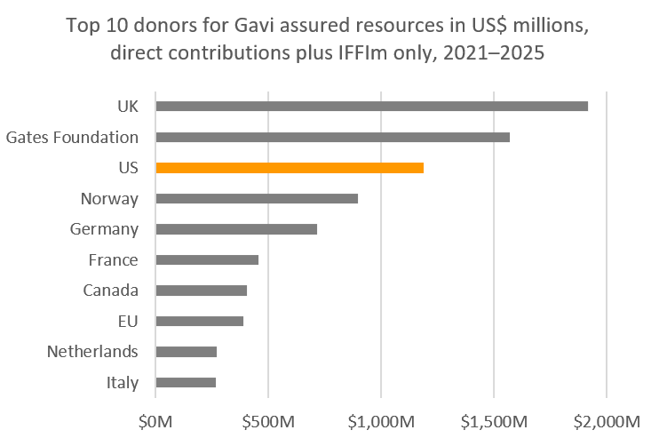 The U.S. has been one of the largest donors to Gavi, underwriting 13% of its overall budget. Of the $10.3 billion in assured resources 2021-2025, the UK contributed $1.9 billion, the Gates Foundation $1.6 billion, and the US $1.2 billion. Moreover, the U.S. alone provided $4 billion to Gavi’s COVAX mechanism, accounting for one-third of its funding and enabling equitable COVID-19 vaccine distribution.